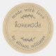 O rótulo Artesanal Caseiro Rústico é um adesivo redondo com fundo de papel kraft quente e letras pretas suaves, além de sotaques botânicos doces. Projetado para produtos caseiros e artesanais, este rótulo é perfeito para guloseimas assadas, potes de geleia, velas, itens enlatados e presentes em pequenas quantidades. A mensagem “feito com amor” e a linha de nome personalizável adicionam um toque pessoal e carinhoso à sua embalagem.
