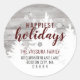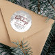 Um adesivo de férias rústico apresenta madeira de celeiro clara com árvores de pinheiro branco e flocos de neve flutuantes. Grafia borgonha e tipografia moderna sobreposta.