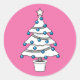 Uma ilustração de uma elegante árvore de Natal branca e chique com muitas bolas azuis penduradas em fundo rosa. Esta design é para pessoas que amam o Natal, dando presentes e presentes.