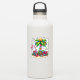 Vinheta de contorno com uma imagem de feriado sazonal. Uma palmeira tropical decorada em luzes festivas com uma estrela no topo. Uma bengala branca e vermelha gigante que sai da areia. Presentes de Natal debaixo da árvore. Whimsical e divertido.