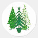 Essas belas adesivos redondos têm três árvores de Natal ou Feriado decoradas e em vasos verdes em diferentes tons de folha de verde simulada com bordas douradas.