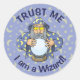 Um velho feiticeiro com capa azul olhando para a bola mágica de cristal.