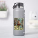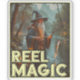 Esta imagem balnear apresenta um feiticeiro parado por um rio numa área florestal, segurando uma vara de pesca com um peixe flutuando em direção à linha. Vestido em trajes de bruxo tradicionais, incluindo um roupão longo e um chapéu pontiagudo, o bruxo lança um feitiço mágico durante a pesca. O fundo, com árvores e montanhas, cria uma atmosfera mística e serena. O texto "REEL MAGIC" exibido com destaque na parte inferior da imagem, adiciona um toque humorístico e mágico à cena.
