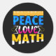 O adesivo de matemática adiciona um toque alegre a livros escolares, bolsas de livros e outras aplicações relacionadas à escola. A design apresenta as palavras "Paz, Amor, Matemática" em letras coloridas.