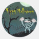 Ótima ilustração de Halloween de uma múmia em uma cena noturna assustadora com uma lua de cheio, árvore de morto e morcegos. Um texto de Feliz Halloween muito detalhado em cor amarela e fonte assustadora.