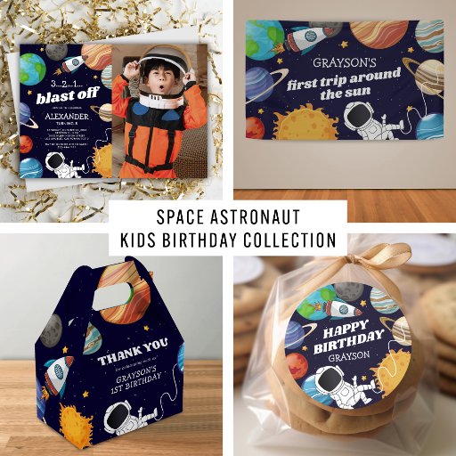 Obrigado personalizado de aniversário espacial, você favorece adesivos com fundo estrelado no céu, planetas do sistema solar espalhados pela borda, um foguete, astronauta, o ditado "obrigado para o fazer meu partido como uma explosão!", e o nome das crianças.