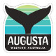 Um design ousado e atraente celebrando Augusta, na Região Sul Excelente da Austrália Ocidental. Esta trabalho de arte apresenta uma silhueta impressionante de uma cauda de baleia contra o fundo vívido do oceano turquesa.