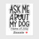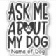 O adesivo "Pergunte-me sobre o Meu Cachorro" está certo de começar uma conversa sobre o seu cão. Personalize esta caneca com o nome do seu cão! Coloque o adesivo em um laptop, tablet, notebook, espelho, telefone, garrafa d'água, moente, janela do veículo, refrigerador ou qualquer superfície lisa.