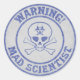Aviso! Mad Scientist - adesivo de humor científico, cartaz azul esmaecida com crânio e bósforos em um fundo de cinza de luz.