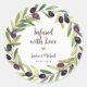 Este adesivo para lembranças de casamento de azeite tem uma grinalda de aquarela de ramos de oliveira com folhas verdes e azeitonas pretas. A mensagem "Infundido com Amor" e os nomes são escritos em uma fonte manuscrita; o resto é escrito em letras maiúsculas. Acima dos nomes há um pequeno coração dourado. O fundo é branco.