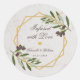 Este adesivo para lembranças de casamento de azeite tem uma moldura dourada irregular geométrica com ramos de oliveira com folhas verdes e azeitonas pretas para cima e para baixo à esquerda sobre dois hexágonos dourados que se sobrepõem. O fundo é de mármore branco. A mensagem "Infundido com Amor" e os nomes são escritos em uma elegante fonte caligráfica; o resto é escrito em maiúsculas. Acima dos nomes há um pequeno coração dourado.