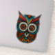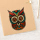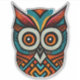 Esta é uma coruja decorativa feita à mão e estilizada com padrões astecas em cores preta, vermelha, turquesa e laranja.