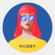 Um adesivo clássico azul-chic redondo com uma mulher clássica, cabelo e óculos vermelhos, e nome personalizável. Para cartas de música, presentes, para escola e escritório.
