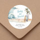 Etiquetas bonitas para surfar em seu bebê convites para chuveiros, favoritos para festas e cartas de agradecimento apresentando uma ilustração aquosa de uma cena de praia com ondas quebrantes, palmeiras, praias arenosas, estrelas e pranchas de surfe, e "Baby on Conselho" mostrado em um divertido roteiro azul retrô. Acrescentar o nome da mãe e a data de chá em letra simples.
