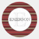 Este é um clássico vermelho do que listras brancas design com nome personalizado e monograma centrado dentro de um círculo.