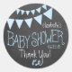 Este Chá de fraldas elegante ajustado elegante, de etiqueta circular, amarrada por metal, que se encontram em artesanatos! Adicione um saco de biscoitos para seus convidados, favores de chá de fraldas. "Obrigado, Chá de fraldas" com o nome da futura mãe e a data do chá de fraldas. Bandeiras bonitas em cores azuis com pegadas de bebê em um quadro de chalkboard. O "Sticker de Chá de fraldas de pegadas" irá adicionar um toque especial ao seu maravilhoso chá de fraldas. Personalize o texto e a cor do texto. CLIQUE EM "PERSONALIZAR TI". Para ver este produto em outras cores e estilos — Visite minha loja "A Princesa Húngara" em www.zazzle.com/hungaricanprincess*. Olhe no meu departamento de categoria "Oh Baby". Parabéns!