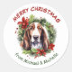 Estes adesivos de Natal bonito apresentam um belo retrato de aquarela de um cão de Caça Basset. O cão é armado com uma tosse de pinheiro, sagrada, bagas vermelhas, e coroa de poinsettia. Seu texto personalizado está vermelho e verde acima e abaixo da imagem. Perfeito para sua correspondência de Natal ou pacotes de presentes.