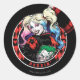 Este emblema circular com o estilo de traje de cartão mostra Harley Quinn a piscar-lhe no ombro enquanto segurava um grande balé.