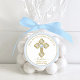 Azul bebê elegante e batismo dourado favorecem autocolantes com uma bela cruz dourada sobre um fundo de um ponto azul bebê. Este adesivo de batismo de menino é facilmente personalizado para o seu evento adicionando seus detalhes. Você pode remover a pérola azul da cruz se preferir.