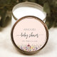 Uma bela borda floral de aquarela de flores silvestres decora a borda inferior deste adesivo de chá de fraldas de vassouras. As palavras "chá de fraldas" aparecem na fonte do script, com alternâncias antes e depois do script. Personalize o texto com o nome da futura mãe em serif e a data no texto da cinza de carvão em sans serif em um fundo rosa-claro.