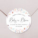 Elegante adesivo de chá de fraldas neutro por gênero para seus convites, favoritos para festas e cartões de agradecimento com aquarelas de flores silvestres delicadas e "Baby in Bloom" escritos em um roteiro na moda. Personalize com o nome da data de mamãe e chá.