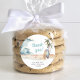 Etiquetas bonitas para o surf para os seus favoritos para festas de chá de fraldas e cartas de agradecimento com uma ilustração aquática de uma cena de praia tropical com ondas quebrantes, palmeiras, praias arenosas, estrelas e pranchas de surfe, e "Obrigado!" e "Bebê no Conselho" mostraram em um divertido roteiro azul. Acrescentar o nome da mãe e a data de chá em letra simples.