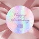 Um arco-íris, fundo holográfico em rosa, roxo, ouro rosa e verde de menta. Decorado com pó de brilho falso. Com o texto: Feliz aniversário xoxo. (abraços e beijos)