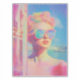 Esta incrível imagem inspirada na arte pop apresenta uma mulher confiante em óculos escuros de tamanho excessivo refletindo uma cidade litorânea iluminada pelo sol. Banhado em matizes elétricas de neon e tons pastéis macios, o trabalho de arte irradia vibrações retrorreflectoras e energia de escape do verão. Perfeito para fãs de arte colorida de moda, cenas de férias sonhadoras e decoração de declaração de na moda — ideal para impressões, roupa e acessórios de moda.