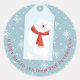 Tendência moderna, azul-presente sazonal, embrulho-presente ou selo redondo, em azul empoeirado e branco, com neve em queda, e um urso polar branco giro com um cachecol vermelho.++++++++ Personalize-o com o seu texto!