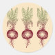 Uma ilustração vegetal vintage de uma beterraba é colorida em vermelhos e verdes.