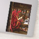 Dragão vermelho sentado no computador, lendo um livro. Por trás há um equipamento de podcasting e um computador em sua mesa.