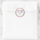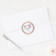 Um adesivo de casamento com um design de casamento do estilo moderno - lábios de kissy cor-de-rosa glamourosos e uma ilustração de bigode retrô masculino. Colocado sobre um fundo de fêmur de pêssego com um quadro circular rosado no centro. O texto diz que o Sr. e a Sra. podem personalizar com seus nomes e data de casamento.