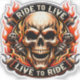 "Unleash your free spirit with this bold, high-octane design perfect for motorcycle enthusiasts. Featuring a striking skull engulfed in roaring flames and the iconic 'Ride to Live, Live to Ride' motto. With its vibrant colors and sharp details, this tee is a must-have for every road rebel