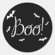 Um adesivo preto e branco do Halloween Boo! com tipografia peculiar com morcegos. Este adesivo é perfeito para os favores do Halloween.