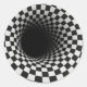 A tunnel-like optical illusion is created using a black and white checkered pattern, giving a dizzying sense of depth