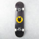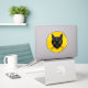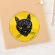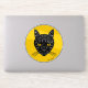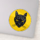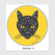 A retro-looking illustration of the face of a yellow-eyed black cat appears in a moon-like circle in this original Halloween-appropriate art by Richard H. Fay.