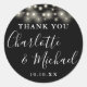 Preto e branco favorece obrigado seu adesivo redondo clássico com luzes bonito de cordas e nomes de estilo de assinatura. Personalize com seu obrigado especial você detalha na tipografia branca moderna. Projetado por Thisnotme©