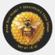 A captivating sticker designed to give your honey jars a professional and high-end artisanal look. This design features a highly realistic illustration of a plump honey bee centered over a deep, glowing golden honeycomb background. A single, rich honey drop is falling from the bee's abdomen, emphasizing the pure and raw quality of your product.