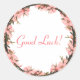 Coroa floral rosa com texto personalizado lendo: "Boa Sorte"