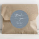 Este obrigado azul empoeirado de boho que o teu casamento favorece o adesivo redondo clássico é perfeito para um casamento minimalista. A cinza da boêmia moderna, design azul-clara e neutra, apresenta uma caligrafia rústica simples com um estilo único, mas clássico. Personalize seus adesivos de favor com seus nomes e data de casamento.