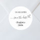 Um adesivo "Salvar data" para o seu casamento. Um texto branco preto. Decorado com um pequeno coração. Personalize e adicione seus nomes e data de casamento.