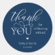 Moderno minimalista de casamento Obrigado Oferece o favorito clássico do Round Sticker, em escrita romântica, pequeno coração bonito, com assinatura de noiva e noiva e data de casamento, no tema azul clássico do marinho.
