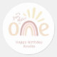 Este arco-íris e primeiro aniversario de sol é perfeito para um primavera ou festa de aniversário de verão. O simples arco-íris monocromático e raios solares é delicado e doce para o seu pequeno. Simplesmente personalize este adesivo para um adorável sotaque de aniversário de Verão!