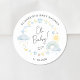 Um adesivo de chá de bebê Whimsical que apresenta "Oh Baby!" num guião na moda moderno e aquarelas azuis e amarelas inspiradas no ventre de um arco-íris, sol, corações, estrelas, luas e nuvens. Personalize com o nome da futura mãe e a data de chá em uma simples tipografia.