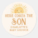 Este adesivo de chá de fraldas com tema solar apresenta o texto "Aqui Vem O Filho" na tipografia de na moda com um lindo sol de cor amarela em um fundo de creme macio. Facilmente personalizável. Original Watercolor © Michele Davies.