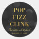 Adesivo elegante com as palavras "Pop Fizz Clink" em folha de ouro falso sobre um fundo de luzes bokeh cinza escuro. Perfeito para festas de noivado, casamentos, aniversários, datas comemorativas ou vários outros eventos.