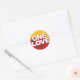 Este adesivo apresenta as palavras "UM AMOR" em letras brancas a negrito num fundo predominantemente amarelo e vermelho, com uma pequena quantidade de verde. Um Amor. É tudo que precisamos.