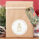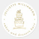 Um adesivo de embalagem limpo, profissional e moderno para designers de bolo e estilistas de bares de sobremesa. Esta design apresenta uma imagem manuscrita de um bolo em três camadas em ouro falso no centro, e detalhes comerciais em ouro falso em formato circular, em um fundo branco.
