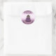 Um bolo moderno de três camadas em roxo profundo com bolinhas brancas e um arco de chocolate. Diz obrigado, mas esta mensagem pode ser alterada para outra coisa, se assim o desejar.