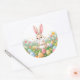 Coelho da Páscoa giro sentado no cheio de capim de flores amarelas, cor-de-rosa e azuis e ovos de Páscoa.